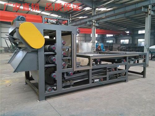 洗砂场污泥脱水机经若干个压榨辊反复压榨,上下两条滤带在经过交错各辊形成的波形路径时, 由于两条滤带的上下位置顺序交替,对夹持的泥饼产生剪切力, 将残存于污泥中的水分绝大部分积压滤除,促使泥饼再一次脱水,后通过刮刀将干泥饼刮落。